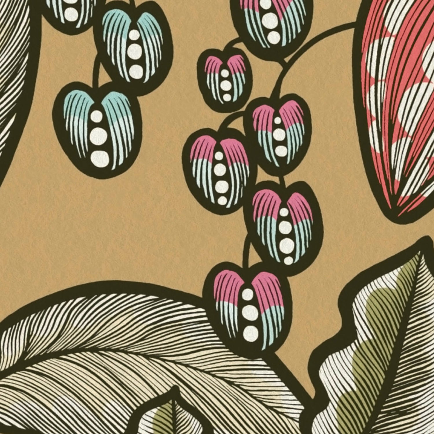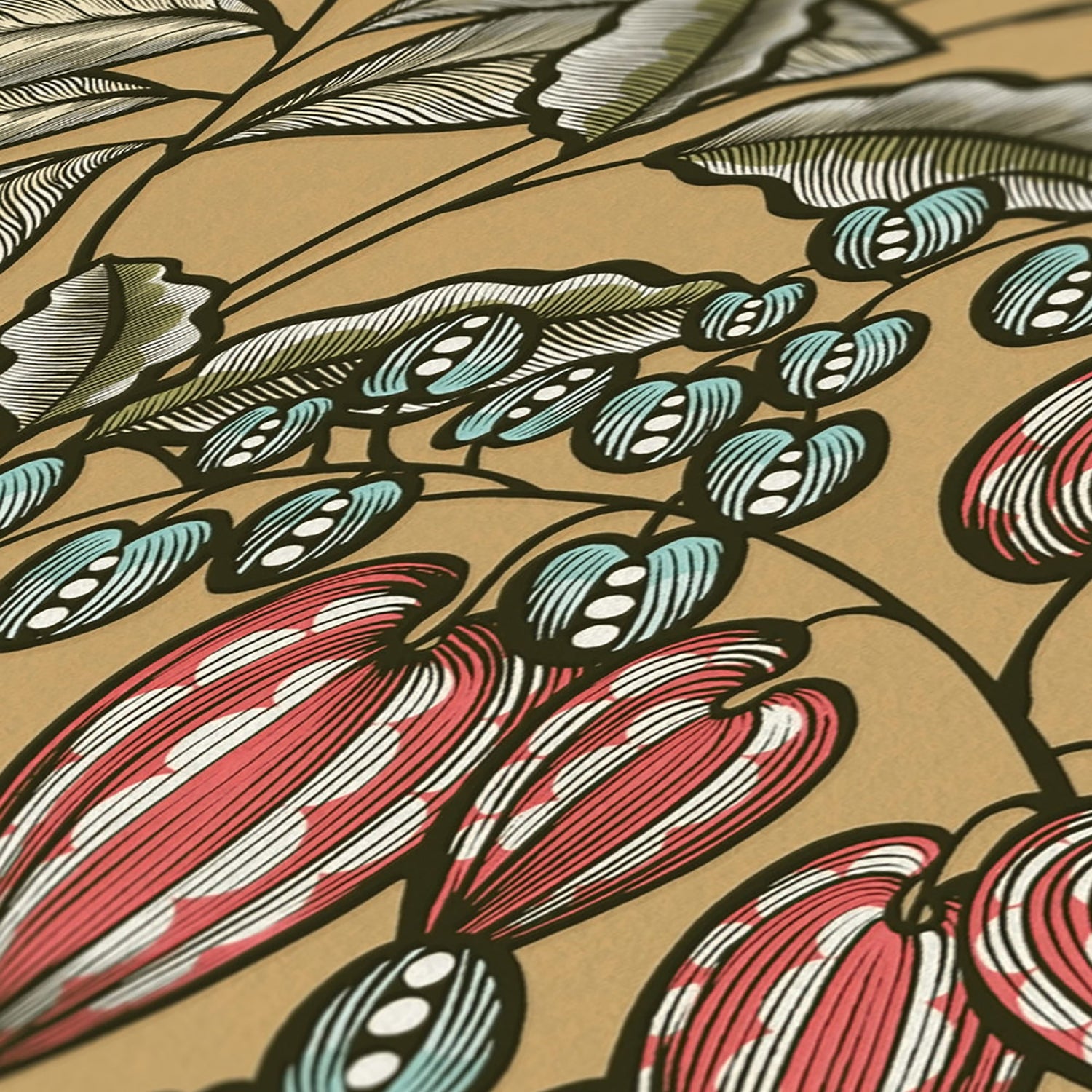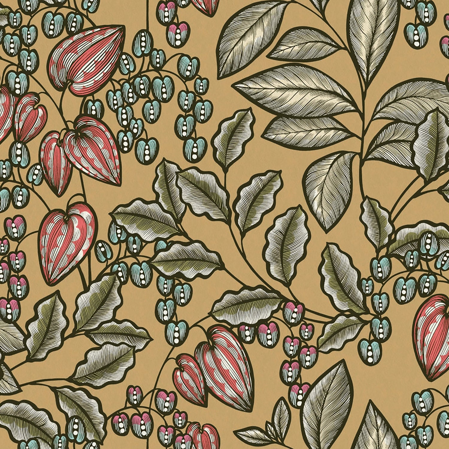 Biophilic design and Art Nouveau stylings merge in this charming wallpaper. A variety of climbing vines feature a blend of green, red, aqua and pink hues and thick black outlining against a mustard yellow backdrop. Leif is an unpasted, non woven wallpaper measuring 20.9 inches wide by 33 feet long, covering approximately About 57.5 square feet square feet per roll